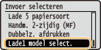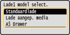 Als u de optionele A5-cassette of de cassette voor aangepaste media gebruikt, moet u <Lade1 model select.> invoeren. Als u de optionele papierlade vervangt door de standaard papierlade, moet u de instelling weer terugzetten op <Standaardlade>.