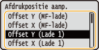 U kunt <Offset Y> en <Offset X> in het instellingenmenu van het bedieningspaneel gebruiken om de afdrukposities voor alle types drukwerk aan te passen, ongeacht de papierbron. U kunt de afdrukpositie instellen in het bereik -50,0 tot +50,0 mm in stappen van 0,5 mm in beide richtingen: verticaal en horizontaal. Offset Y/Offset X
