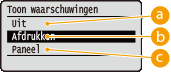 Sterretjes (*)Instellingen die zijn gemarkeerd met een sterretje (*), worden niet weergegeven, afhankelijk van andere instellingen en het feit of er een optionele SD-card op het apparaat is geïnstalleerd.