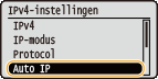 .U kunt slechts één van de protocollen DHCP, BOOTP, en RARP gebruiken. Als het geselecteerde protocol wordt ingesteld op <Aan>, worden de andere twee protocollen automatisch ingesteld op <Uit>.