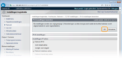 Instellingen selecteren vanaf het bedieningspaneelTevens kunt u IPv6-adressen in- of uitschakelen in het instellingenmenu van het bedieningspaneel. IPv6-instellingen