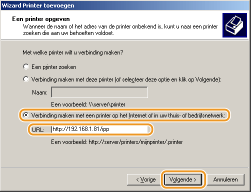 Selecteer [Verbinding maken met een printer op internet of op uw intranet:], voer de verbindingsbestemming in en klik op [Volgende].
