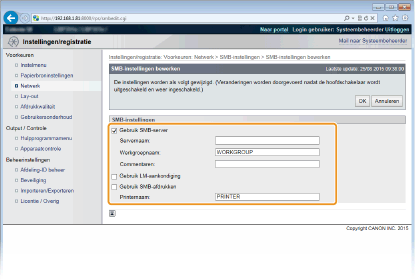 Als u SMB afdrukken met het apparaat gebruikt, activeer dan het selectievakje.