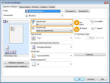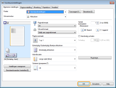 Op de voorbeeldafbeelding kunt u gemakkelijk, op intuïtieve wijze, instellingen zoals de paginalay-out en inbindpositie opgeven. Klik voor meer informatie op [Help] in het scherm van het printerstuurprogramma.