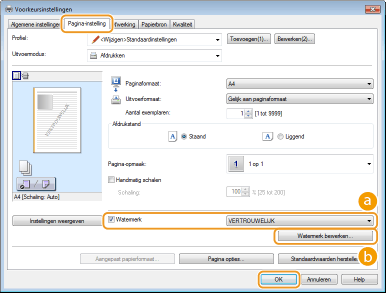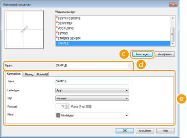 Klik op deze tabbladen om de tekst, kleur of afdrukpositie van het watermerk op te geven. Klik voor meer informatie op [Help] in het printerstuurprogramma.