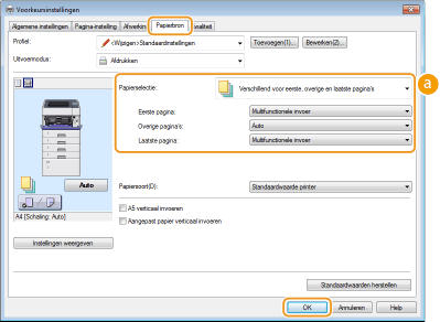 Tevens kunt u het papier opgeven voor de pagina die volgt op de voorpagina, en het papier opgeven in [Verschillend voor eerste, overige en laatste pagina's]. U kunt ook afdrukken door de papiersoort in te voeren in [Papiersoort].