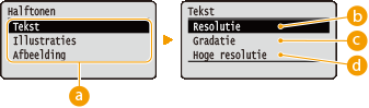 Selecteer het soort afbeeldingsgegevens waarvoor u de instellingen wilt veranderen. Selecteer <Tekst> voor tekens, <Illustraties> voor lijnen en figuren, of <Afbeelding> voor afbeeldingen zoals foto's.