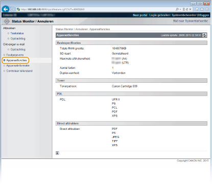 Maximaal 200 (via computers en USB-geheugenapparaten) afgedrukte documenten worden weergegeven.