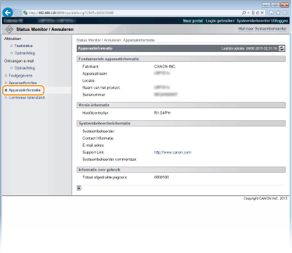 [Beheerinstellingen] op de pagina [Instellingen/registratie] (Het wachtwoord van de systeembeheerder instellen).