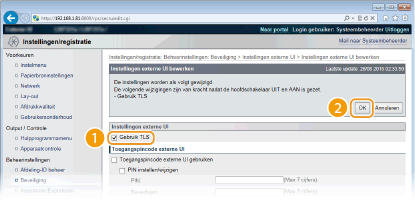 Tevens kunt u TLS beveiligde communicatie in- of uitschakelen in het instellingenmenu van het bedieningspaneel. Instell. externe UI