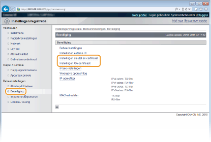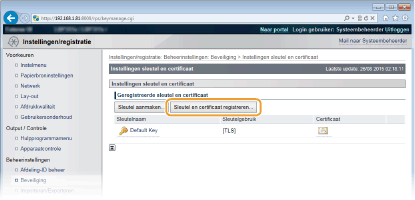 Klik op [Instellingen sleutel en certificaat] voor het installeren van een sleutelpaar, of [Instellingen CA-certificaat] voor het installeren van een CA-certificaat.