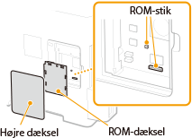 Dette afsnit beskriver, hvordan man installerer Barcode Printing Kit-F1 eller PCL International Font Set-C1 i maskinen. ROM bruges tilsluttet ROM-stikkene bag maskinens højre dæksel. Læs forholdsreglerne i Installation, før du installerer ROM.