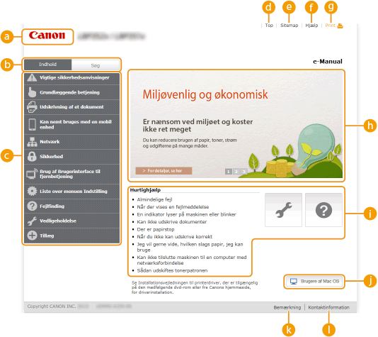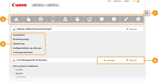e-Manual er inddelt i forskellige skærme, og indholdet af de enkelte skærme varierer.