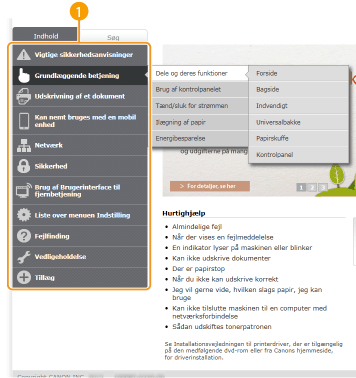Viser emnerne i det valgte kapitel. Hvis der vises et "+" på emnet, vises det pågældende emnes underafsnit, når du klikker på det. Klik på "-" for at skjule det udvidede emne.