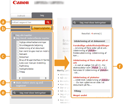 Viser resultatet af søgningen med de sider, der indeholder de angivne søgeord. I resultaterne kan du finde den side, du leder efter, og klikke på sidens emnetitel. Hvis resultatet ikke kan vises på én side, skal du klikke på