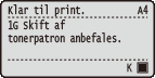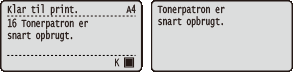 Hvis meddelelsen <Tonerpatron er snart opbrugt.> vises, standses udskrivningen midlertidigt. For at genoptage udskrivningen skal du trykke på