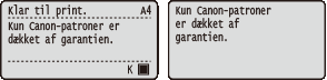 Du kan fortsætte med at udskrive, når denne meddelelse vises, men udskriftskvaliteten kan forværres. Hvis du gør det, kan det resultere i, at maskinen beskadiges.