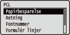 Alle indstillinger om PCL-kontrolkommandoerne vises med korte beskrivelser. Standardindstillingerne er angivet med en daggert (