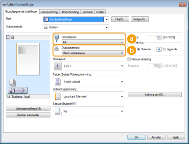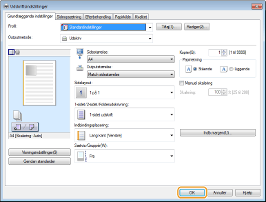 Du kan nemt angive sidelayoutet, indbindingspositionen osv. på en intuitiv måde på eksempelbilledet. Du kan få flere oplysninger ved at klikke på [Hjælp] på skærmen for printerdriveren.