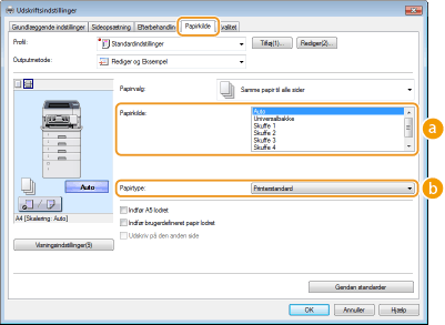 Papirkilden vælges automatisk i henhold til det angivne format og den angivne type af det papir, der skal udskrives på, og de indstillinger, der er konfigureret i maskinen.