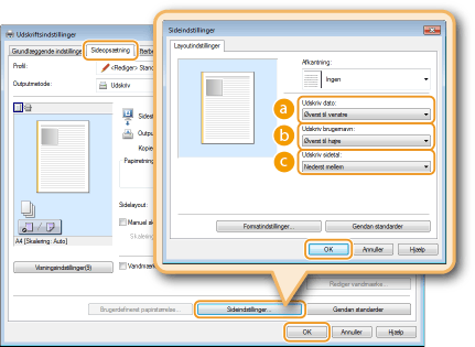 Vælg udskriftsplaceringen af udskriftsdatoen, brugernavnet eller sidetallet