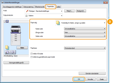 Du kan også angive papiret for den side, der følger efter omslaget, samt angive papiret i [Forskellig for første, øvrige og sidste]. Du kan også udskrive ved at angive papirtypen i [Papirtype].
