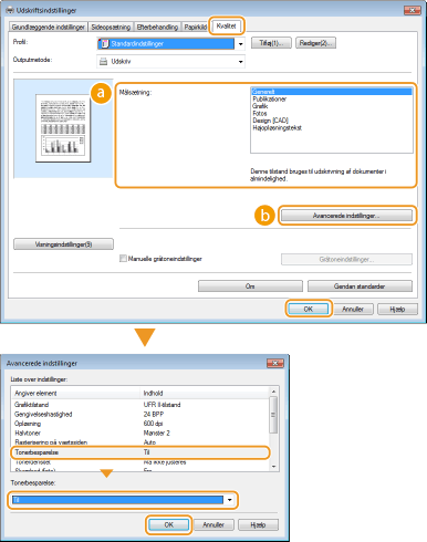 Vælg [Tonerbesparelse] på skærmen [Avancerede indstillinger]