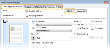 Klik på fanerne [Grundlæggende indstillinger], [Sideopsætning], [Efterbehandling], [Papirkilde] eller [Kvalitet] for at angive udskriftsindstillingerne på hver enkelt skærm efter behov.