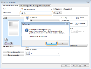 Vælg [Gem] i [Outputmetode], og klik på [Ja].
