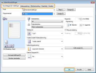 Klik på fanerne [Grundlæggende indstillinger], [Sideopsætning], [Efterbehandling], [Papirkilde] eller [Kvalitet] for at angive udskriftsindstillingerne på hver enkelt skærm efter behov.