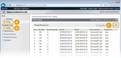 Historikken med op til 200 udskrevne dokumenter, der er lagret i maskinen, vises (kun, hvis SD-kortet er installeret).
