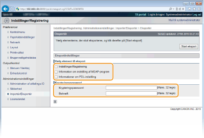 For at eksportere indstillingsdata for elementer, der kan indstilles fra [Indstillinger/Registrering] på portalsiden, skal du vælge afkrydsningsfelterne for elementerne.