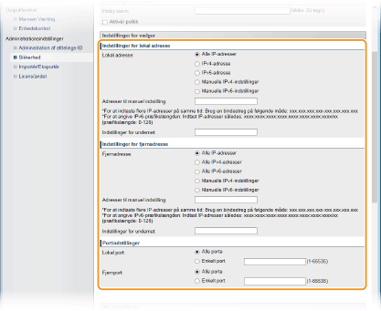 Vælg indstillingen for at angive en enkelt IPv6-adresse eller et udvalg af IPv6-adresser for at anvende IPSec. Angiv IPv6-adressen (eller området) i tekstfeltet [Adresser til manuel indstilling] .