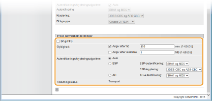 ESP er aktiveret, og krypteringsalgoritmen er indstillet til [3DES-CBC og AES-CBC].