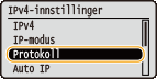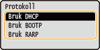 Velg <Bruk DHCP>, <Bruk BOOTP> eller <Bruk RARP>, og trykk på