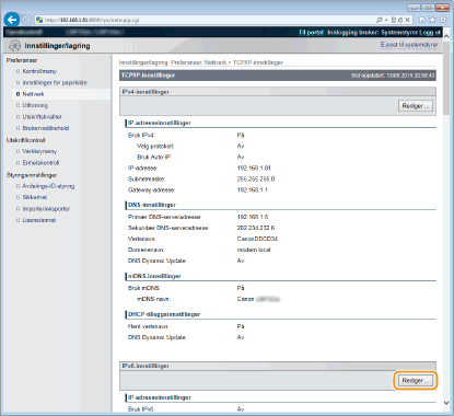 Velge innstillinger fra betjeningspaneletDu kan også aktivere eller deaktivere IPv6-adresser via innstillinger-menyen på betjeningspanelet. IPv6-innstillinger