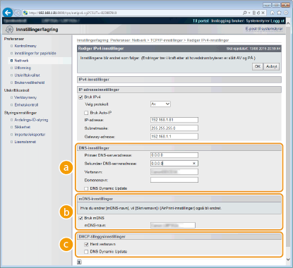 Velg avkrysningsboksen for å oppdatere DNS-registrene dynamisk når maskinens IP-adresse endres. [mDNS-innstillinger][Bruk mDNS]
