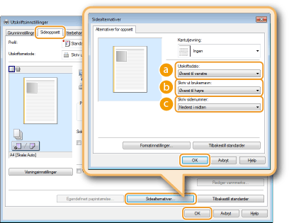 Du kan endre formateringsdetaljer som skrifttype og skriftstørrelse ved utskrift av datoer, påloggingsnavn eller sidenumre. Klikk på [Formatinnstillinger] på Sidealternativer-skjermbildet vist over for å spesifisere detaljene.