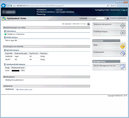 For ekstern betjening må du angi IP-adressen til maskinen i en nettleser og starte Fjernkontroll. Kontroller IP-adressen som er angitt på maskinen, på forhånd (