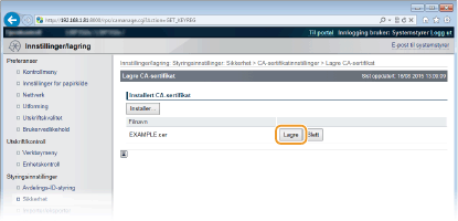 Klikk på [Lagre] til høyre for CA-sertifikatet du vil registrere.