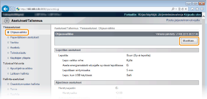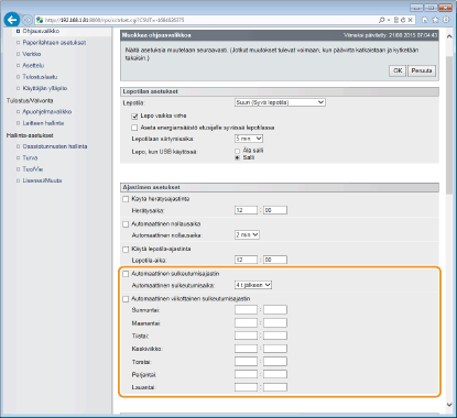Voit määrittää laitteen sammumaan automaattisesti, kun sitä ei käytetä pitkään aikaan. Voit myös määrittää laitteen sammumaan tiettyyn aikaan. Näiden toimintojen avulla voidaan välttää tarpeetonta energiankulutusta, jos virta unohdetaan katkaista. Tämä toiminto on oletusarvoisesti käytössä.