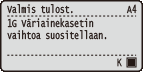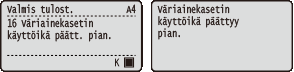 Kun ilmoitus <Väriainekasetin käyttöikä päättyy pian.> tulee esiin, tulostus pysäytetään tilapäisesti. Voit jatkaa tulostusta painamalla