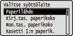 Yleiset asetuksetAsetukset ovat samat kuin <Paperilähde>-asetukset kohdassa Asetusvalikko. Tässä määritettyjä asetuksia käytetään myös <Paperilähde>-asetuksissa.