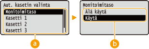 Kun <Monit.taso eri pap.>-asetukseksi on valittu <Kyllä>, paperia syötetään ensisijaisesti paperikasetista, vaikka <Monit. etusijalla>-asetukseksi olisi valittu <Kyllä>.