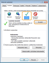 Valitse [Suojaus]-välilehdestä [Luotettavat sivustot] ja napsauta [Sivustot].