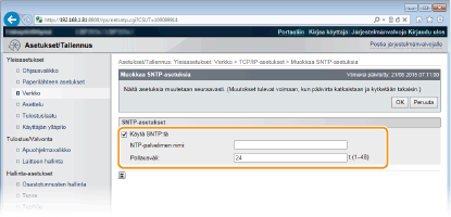 SNTP (Simple Network Time Protocol) -protokollan avulla voit säätää järjestelmän kelloa käyttämällä verkossa olevaa aikapalvelinta. SNTP-protokollaa käytettäessä järjestelmä tarkistaa aikapalvelimen säännöllisesti, jotta järjestelmän kello on aina oikeassa ajassa.