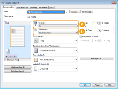 Voit määrittää sivun asettelun, sidontakohdan yms. helposti ja intuitiivisesti esikatselukuvassa. Lisätietoja saat valitsemalla tulostinajurinäytön kohdan [Ohje].