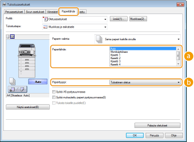 Paperilähde valitaan automaattisesti tulostettavan paperin koko- ja tyyppimäärityksen sekä laitteen asetusten mukaan.
