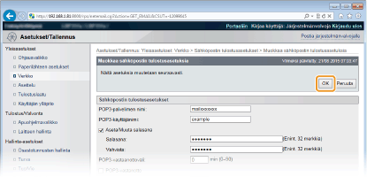 Valitse valintaruutu, kun haluat ottaa käyttöön sähköpostitulostuksen POP3-postipalvelimelta. Voit määrittää tämän asetuksen myös käyttöpaneelin asetusvalikon kohdassa <POP3-vastanotto> (