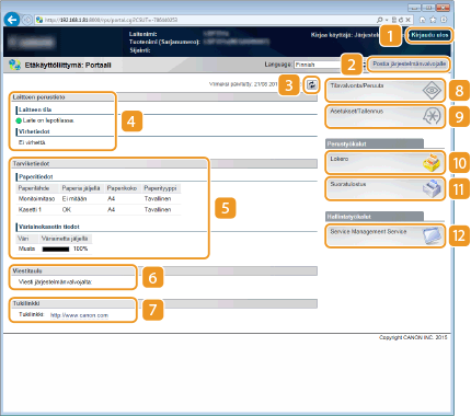 Näyttää paperin tiedot ja jäljellä olevan väriaineen määrän väriainekasetissa.